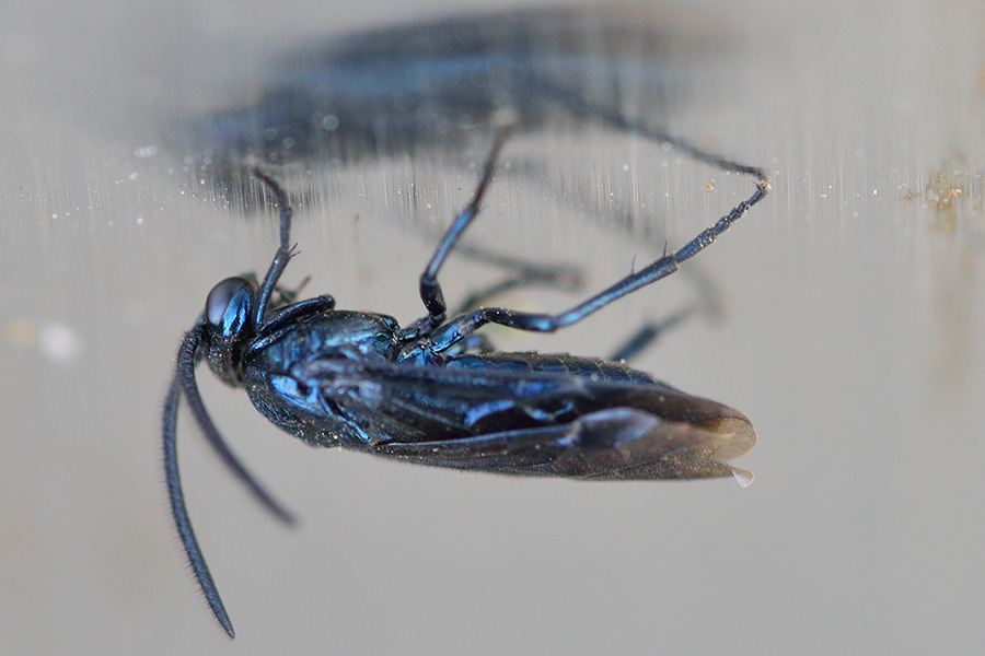 チュウレンジバチの仲間では脚部も含めて全身黒、または濃い瑠璃色をしているので、比較的判り易いかもしれません。ミフシハバチ科なので、触角が3節しかなく、触角の見えている殆どが第3節ということになります。