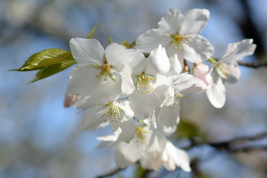 純白で大きく開花する美しい桜で、開花時には葉も展開しています。