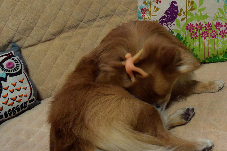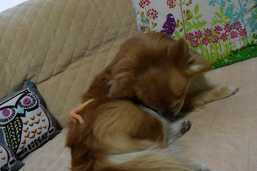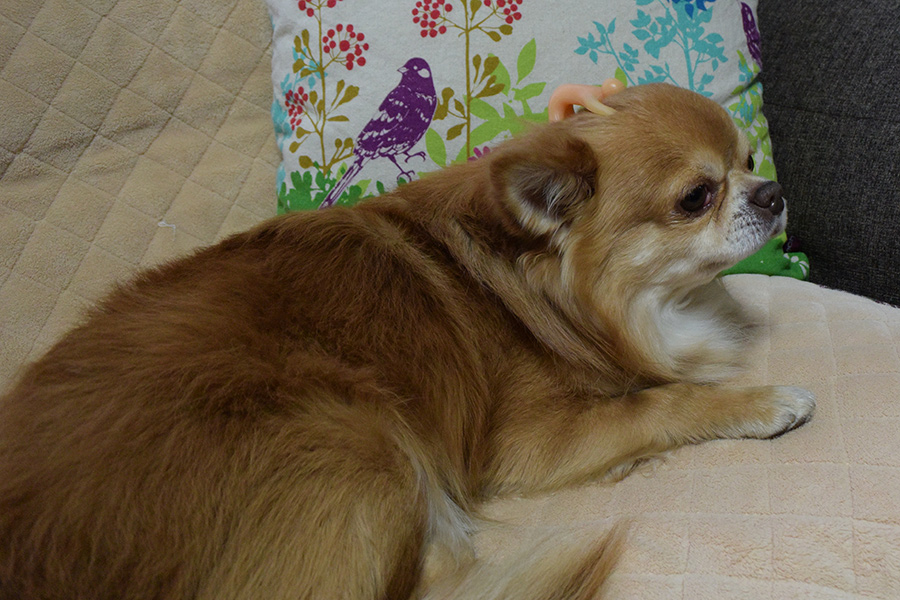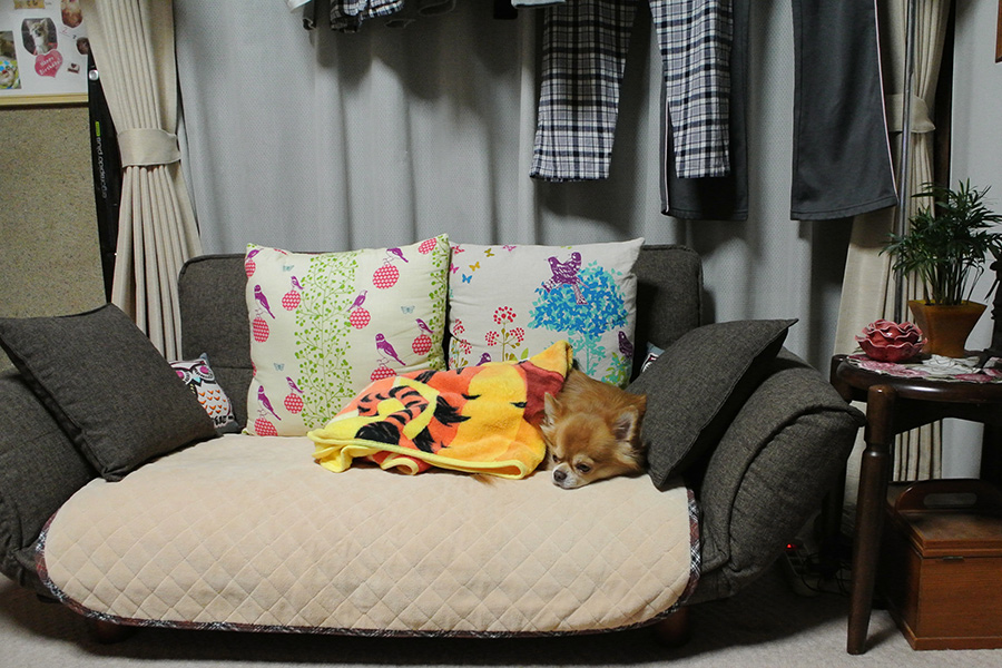 部屋干しの洗濯物の下でしょんぼりしてしまいます。