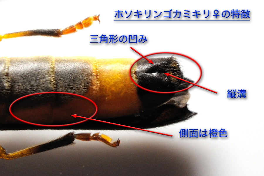 ♀の腹部の黒い部分は側面まで染まっていることはなく、腹端は三角形に凹んでいて、その中央には縦に溝が走っています。