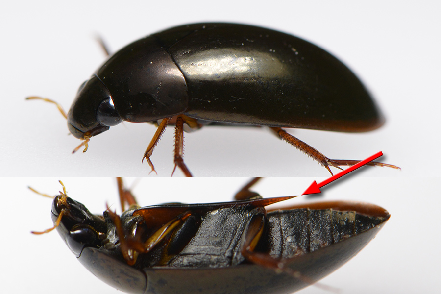虫好き、特に甲虫好きとしてはお恥ずかしい限りなんですが、還暦を2年も過ぎた今になって、ガムシの[が]は牙のことらしいと知りました。牙といっても口器ではなく、胸腹板を縦に貫くようにあって、その長さ(突出度合い)も同定ポイントになるみたいです。
