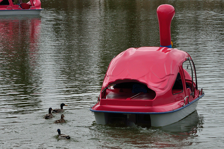 マガモがスワンボートを追っています。