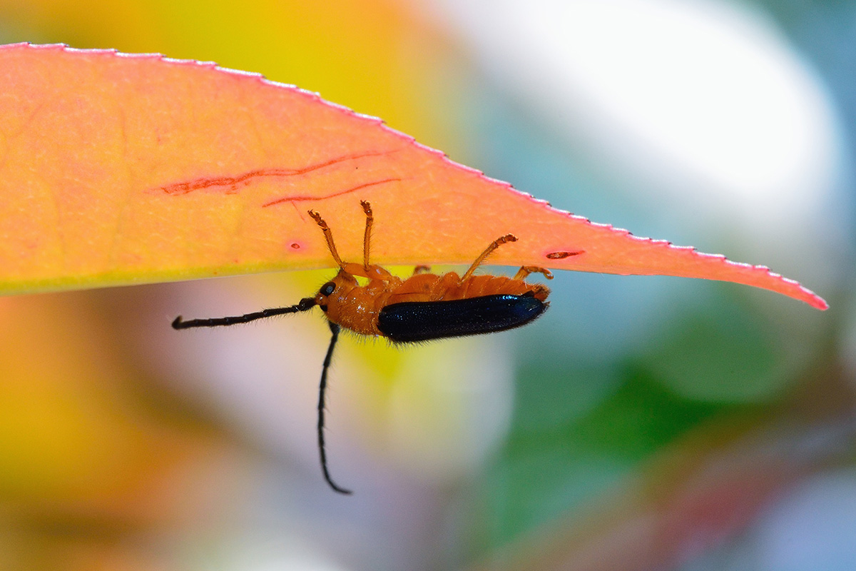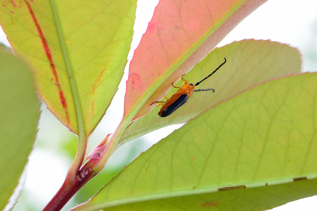 ハムシサイズの美しいカミキリムシで、かつて梨園を荒らし農家を苦しめたそうですが、今は街のカミキリムシとして生け垣のレッドロビン(※セイヨウベニカナメモチ)に定着しています。