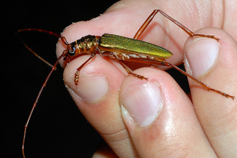 里山のような身近な環境に住むアカアシオオアオカミキリです。