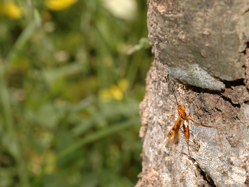 【注】かつてウマノオバチはシロスジカミキリの幼虫を寄主とすると言われていましたが、近年ミヤマカミキリ(蛹)を寄主とすることが判りましたので訂正させていただきました。なお、寄主が単一かどうかはともかく、シロスジカミキリは寄主になっていないと言われています。