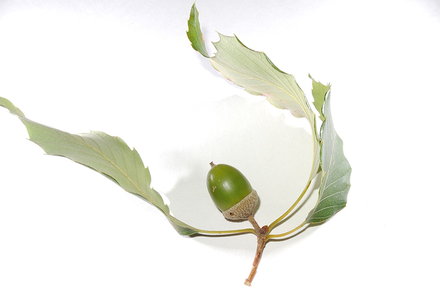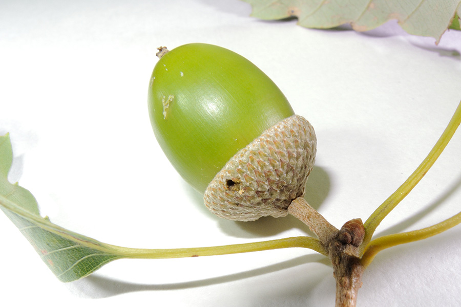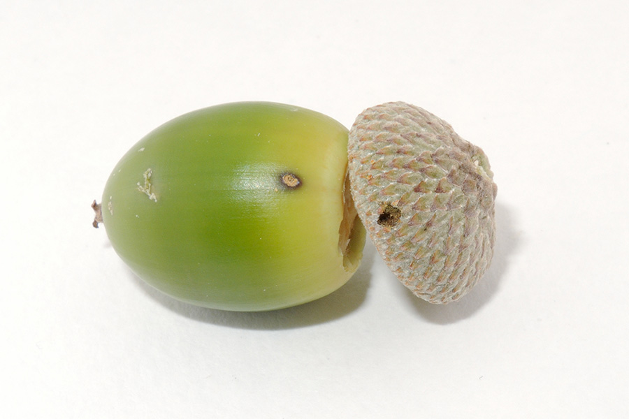 近くの公園で拾ったコナラの枝先ですが、よく見ると団栗の殻斗(かくと:[帽子]の部分)に茶色く変色した痕(穴)があるのが判ります。団栗の中には、小さな卵が産み付けられています。