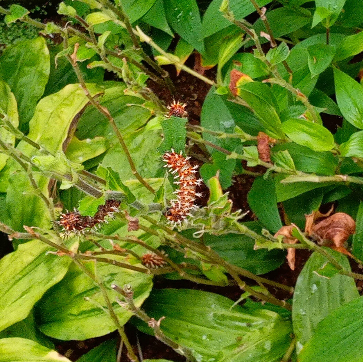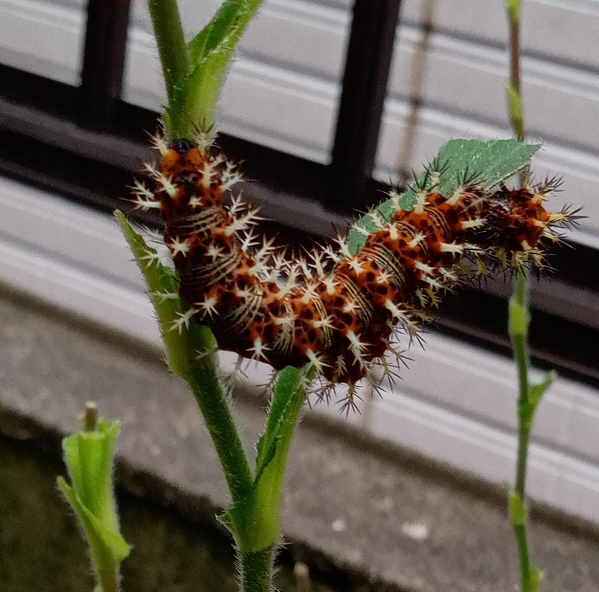 酷暑を乗り切ったホトトギスにルリタテハの赤ちゃんが5頭ばかり取り付いていて、ばりばりと食べてました。