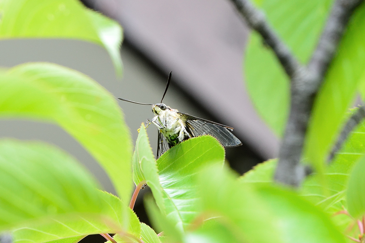 なんとなく視線を感じて見上げると、オオスカシバが休んでいました。