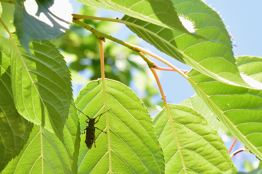 古く苔むしたサクラの幹に5mmほどの穴が開いていたら、ヤツメカミキリの羽脱口の可能性が高く、穴の内側が新鮮なら、かなりの確率で近くにいるのを見つけることができます。