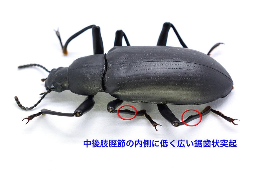 中後肢脛節の内側には低く広い鋸歯状突起があります。