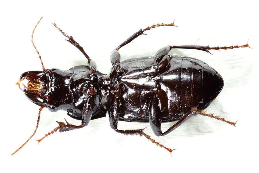 オオゴミムシは触角の付け根側、脚部跗節までほぼ全体が黒いですが、ナガマルガタとオオマルガタの前肢跗節、触角根本付近は褐色です。
