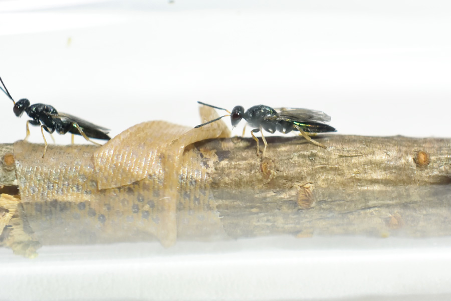 拾った桜の枝から、リンゴカミキリが出るのを待っていたのですが、寄生蜂が3頭羽化してきました。(止まっているのはリンゴカミキリが潜んでいた桜の枝で直径8mmほど)