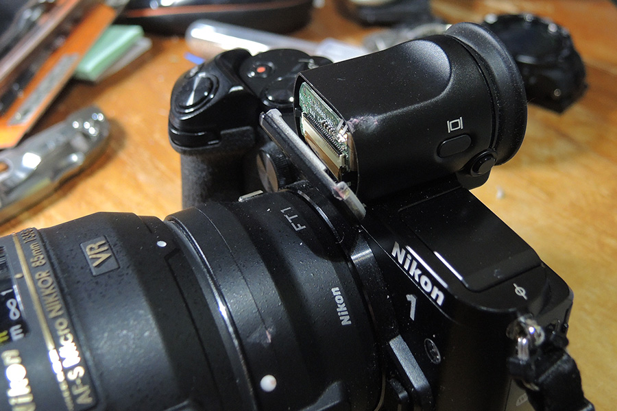 で、セロテープのカッターを落下させてしまい、EVF(電子ビューファインダー)の前面が剥離、歪みも出て、ネジ止め部分は欠けてしまいましたが、機能はしていました。