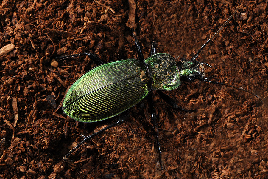 アオオサムシは、関東平野でも普通に見られる大型で美しいオサムシの仲間です。緑色に輝くエリトラ(翅鞘)は個体によって、また光線の状態によって濃い紫から緑まで変化して見えます。
