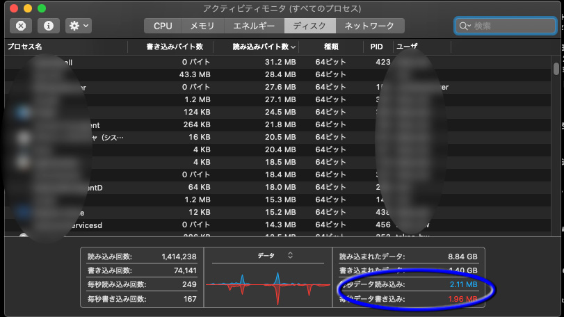 不安ならアクティビティモニタでディスクへのリードライト状況をチェック