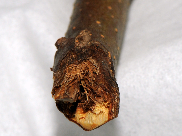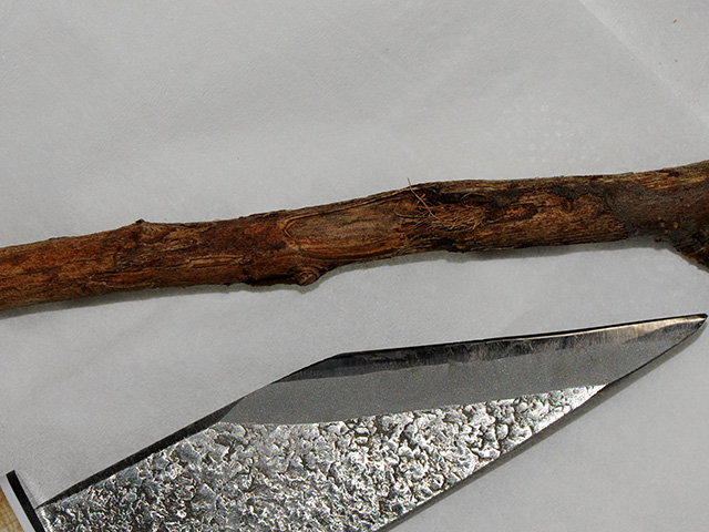 切り出し(左利き用なので裏写真ではありません。念のため)の刃は4センチほどです。枝の太さは煙草ほどで、ルリカミキリは10ミリほどの小型のカミキリムシです。そんな小さなカミキリムシですが成熟するまで、枝の中で2年を掛けます。