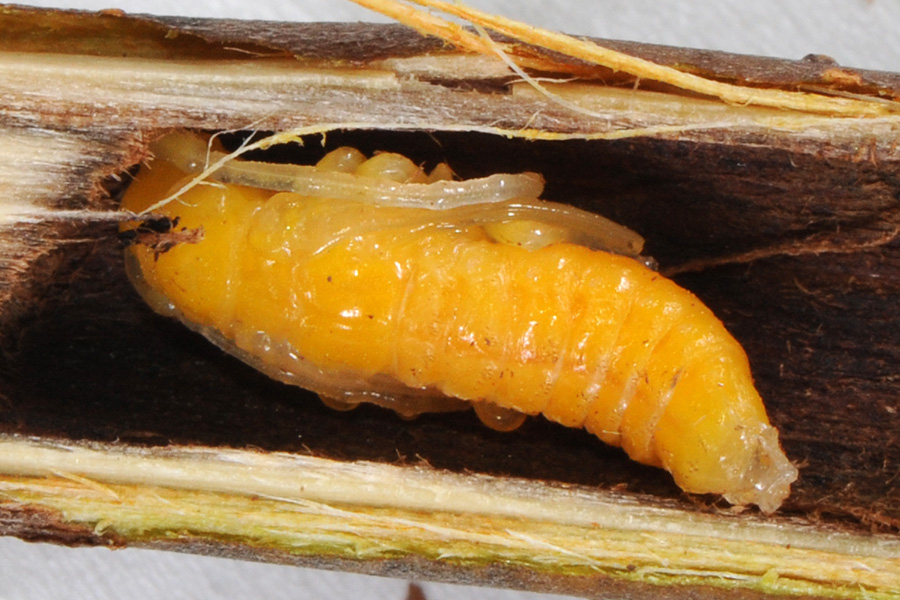 時期的にはもう成虫が潜んでいるかなと期待していましたが、蛹でした。蛹の大きさと比べると、木屑の大きさがお判りいただけると思います。