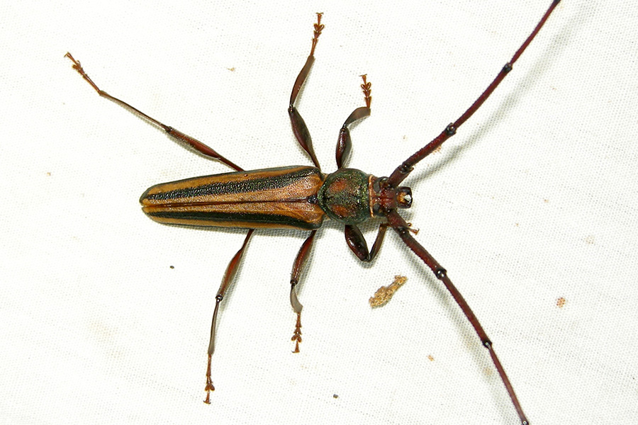 スピードライトを焚いてしまったので判りにくいですが、上翅に特有の模様が見えます。実は茨城県産は初遭遇でして、以前秩父で見た個体(採集後標本整理してから気づきました)はもっと大きなものでした。この個体は小柄で、上の写真のトラフホソバネカミキリのメスの方が大きいくらいです。