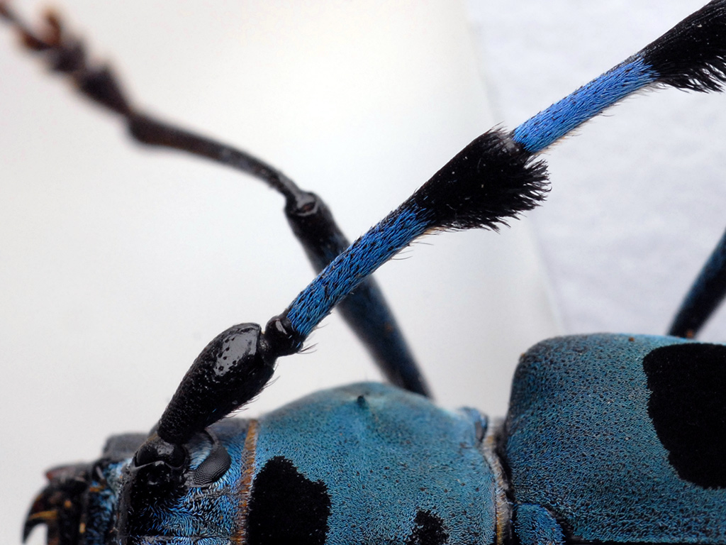 コバルトブルーとマットブラックのコントラストが美しルリボシカミキリですが、その触角の造形美もご覧の通りです。