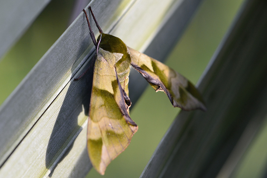 緑色の模様がとても美しい蛾で、スズメガとしてはやや小振りな部類です。後翅には広く赤い部分があります。