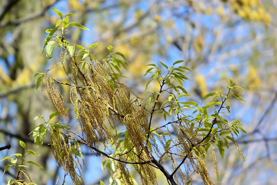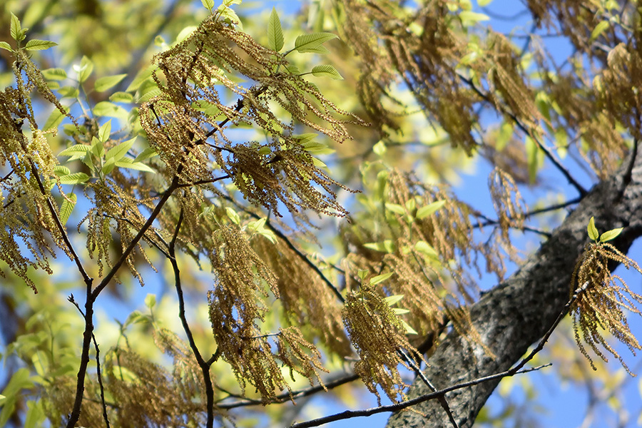 雌雄同株で、雌雄異花の風媒花、初夏に開花しますが、実は翌年の秋に成熟します。
