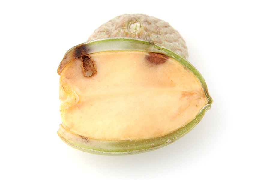 近くの公園で拾ったコナラの枝先ですが、よく見ると団栗の殻斗(かくと:[帽子]の部分)に茶色く変色した痕(穴)があるのが判ります。団栗の中には、小さな卵が産み付けられています。